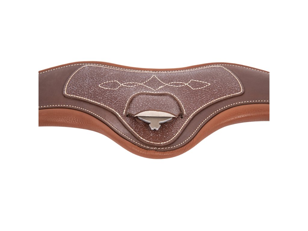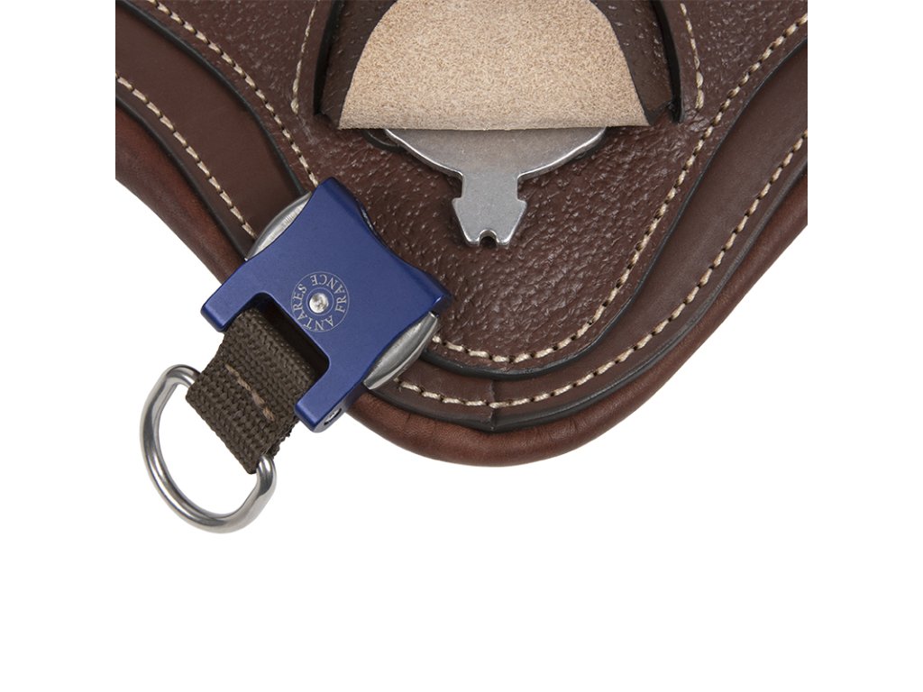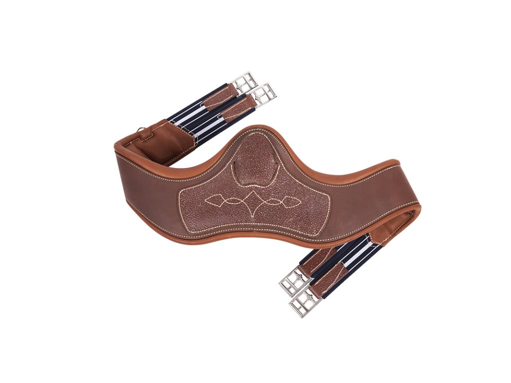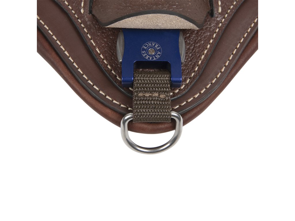 Kožený anatomicky tvarovaný podbrušník od firmy Antarés s gumami šikmo krojenými po oboch stranách. V strede je umiestnená karabina na rýchle upínanie. Podbrušník je veľmi pekne dizajnérsky spracovaný, výborne drží tvar.
